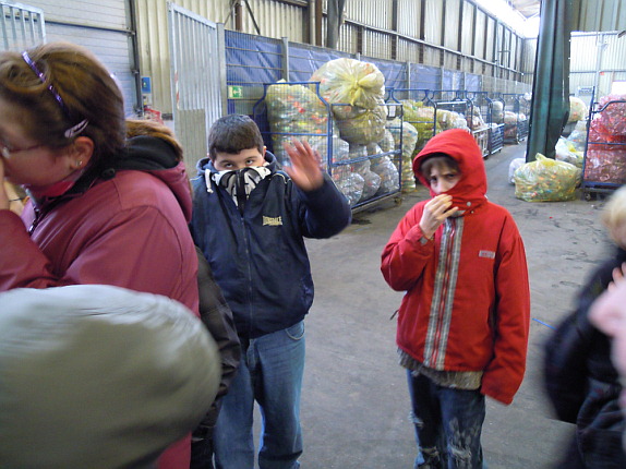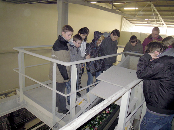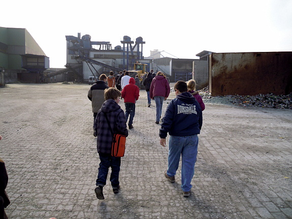 Wir betraten den riesigen Hof, wo LKWs mit Trennwänden für einzelne Glasfarben das Altglas anlieferten. Das Glas würde natürlich gewogen. Wir standen vor meterhohen Glasbergen. Zwischen den grünen Flaschen befanden sich Nutella-Gläser und anderes weißes Glas. Zwischen dem weißen Glas sahen wir farbige Flaschen und Plastikflaschen. Selbst Kissen und Zeitungen mussten aussortiert werden. Verschlüsse wurden durch Magnete abgezogen, Papier wurde weggepustet.