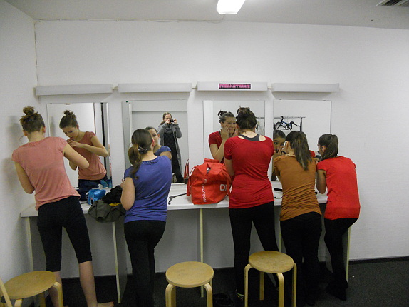 Aber nicht so unserer "WKS-Dance-Company"! Bei der "profimäßigen" Vorbereitung in echten Theatergarderoben wurde in Eigenregie mächtig frisiert,geschminkt und an Kostümen herum gezupft- bis alles so saß, wie es sollte - und auch durch die strenge Sichtkontrolle der Tanzlehrerinnen kam.