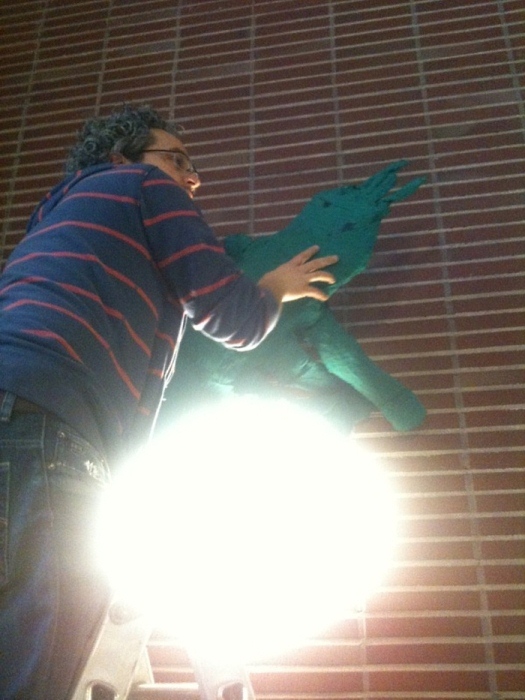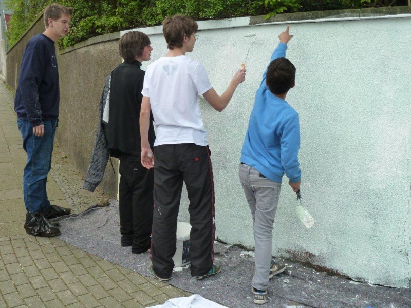 Dienstag, 24.04: Zuerst streichen wir das ausgesuchte Stück Mauer mit Haftgrund (immerhin ca. 12 Meter), damit die anschließende Farbgrundierung gut und lange hält. Dann rollen wir weiße Fassadenfarbe als Untergrund für das Graffiti auf. Glück gehabt: gerade fertig, fängt es an zu regnen... hoffentlich hält die Farbe!