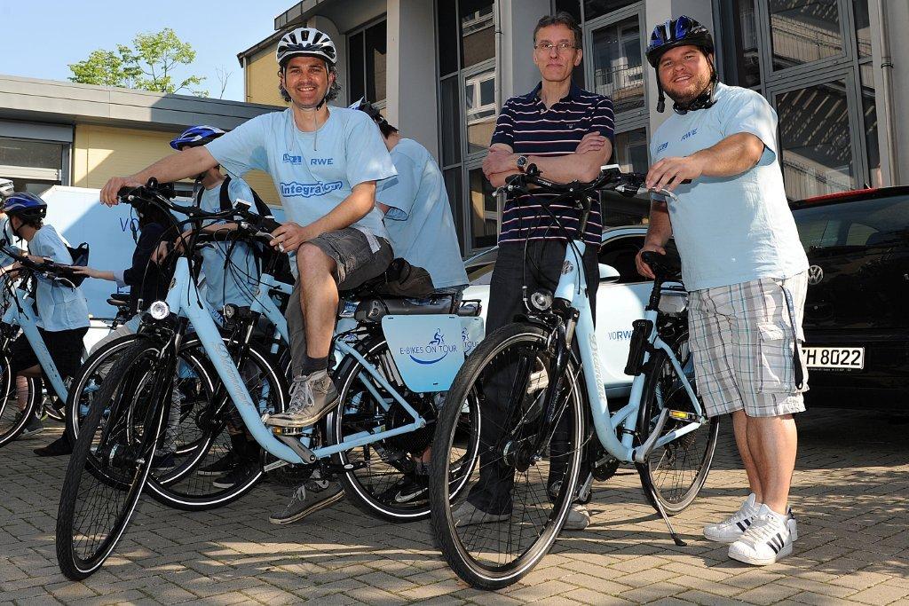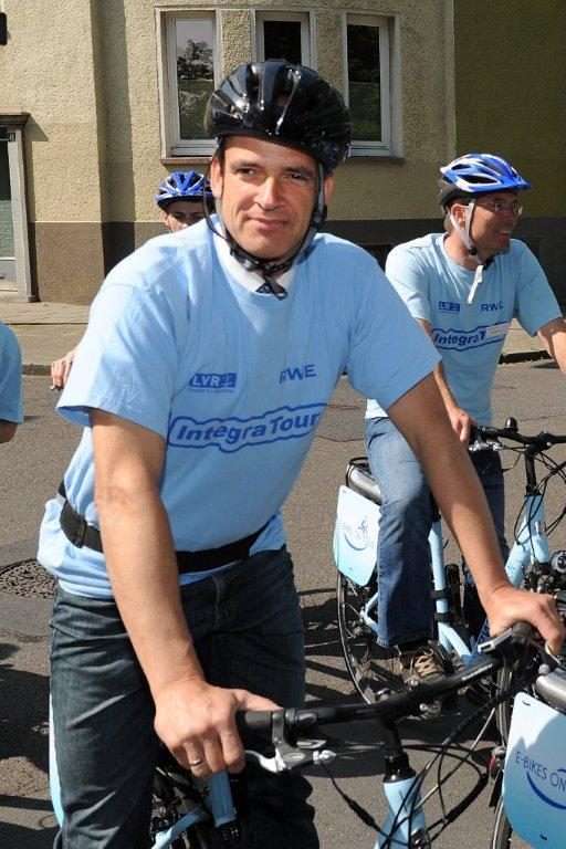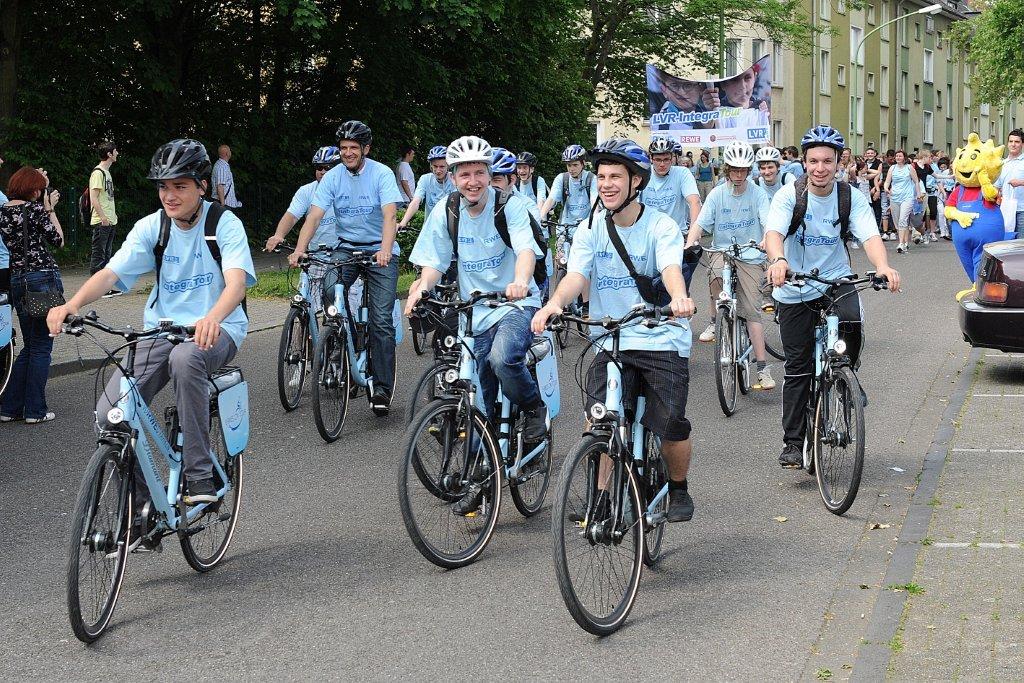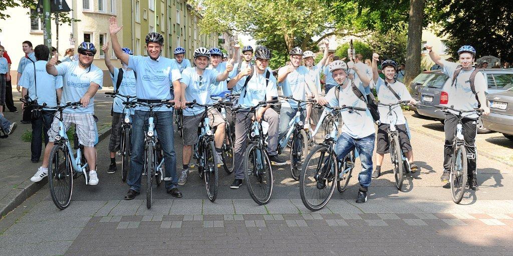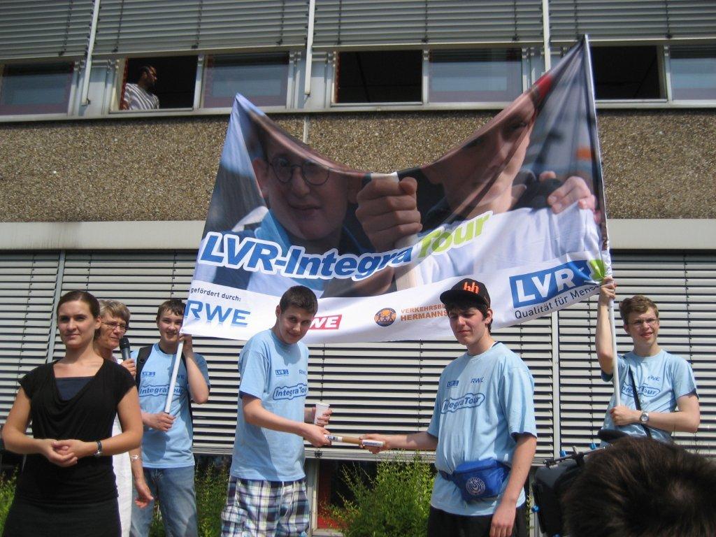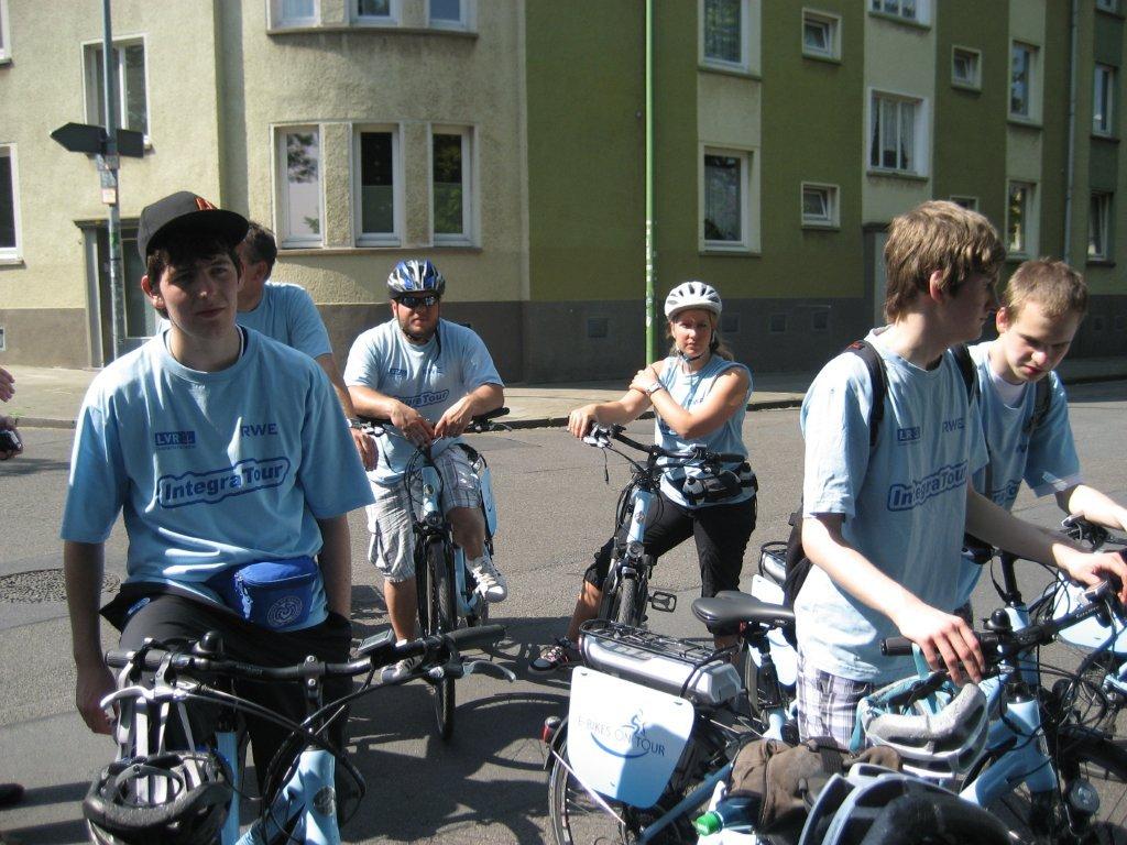 Heute war der erste Teil unserer diesjährigen IntegraTour 2012. Dies ist ein Lauf zum gemeinsamen Miteinander von behinderten und nicht behinderten Menschen. Am heutigen Tag ging es mit der Klasse 10a auf E-bikes zum Rheinisch-Westfälischen Berufskolleg, mit dabei waren LVR Schuldezernent Herr Mertens und RWE Vorstand Herr Böddeling. Bei schönem Sommerwetter ging es erst einmal in Richtung Ruhr und anschließend über den Bahndamm nach Essen-West. Für die knapp 18km Strecke benötigten wir dank der elektronischen Hilfe des Fahrrads ca. 1 Stunde. Am Berufskolleg angekommen gab es einen Mittagssnack, Torwandschießen und eine gemeinsame Kunstaktion in der Turnhalle.