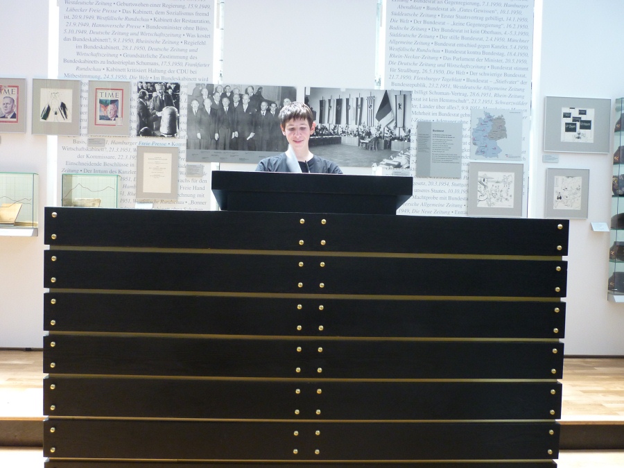 Zahlreiche Filmdokumente, originale Gegenstände, Modelle und interaktive Stationen vermittelten uns einen lebendigen Eindruck der vergangenen Jahre. Wir hatten uns gut auf den Besuch vorbereitet. So konnten wir fast alle Fragen beim Deutschlandquiz richtig beantworten (Dr. Bahr hat als "Publikumsjoker" ein bisschen geholfen ...) und das Lebensgefühl der Menschen in der Bundesrepublik Deutschland und in der DDR nachempfinden. Schwerpunkte der Besichtigung waren: Die Besatzungszonen, Deutschland in Trümmern, der Volksaufstand in der DDR vom 17. Juni 1953, Das Wunder von Bern 1954, der Mauerbau 1961, Sputnikschock und Mondlandung, Hippiezeit und natürlich der Mauerfall von 1989. Besonders bewegend - und schockierend - waren die Berichte über die Toten an der Berliner Mauer.