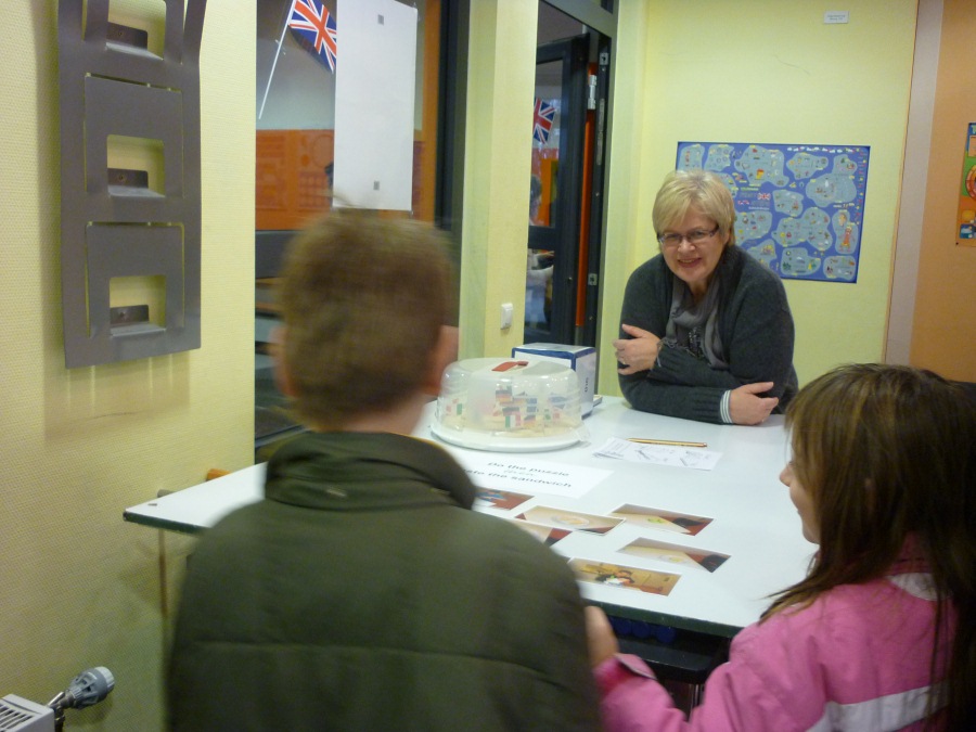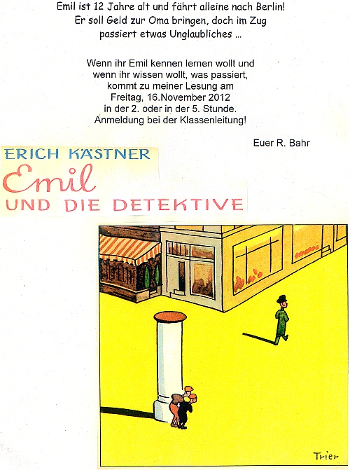 In der Stufe 5 / 6 las der Schulleiter Dr. Bahr " Emil und die Detektive" vor. Er stellte sein schauspielerisches Talent unter Beweis, indem er seine Stimme den jeweiligen Personen angepasst verstellte und er eine Melone (das ist ein runder Hut) aufsetzte.