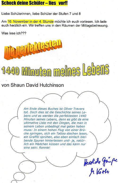Frau Köster hatte ein besonders spannendes Buch ausgewählt für die Stufe 7 / 8: " 1440 Minuten " Wer schnell im Kopfrechnen ist weiß, das sind 24 Stunden bzw. ein Tag und was ein Junge an diesem Tag alles erlebt.