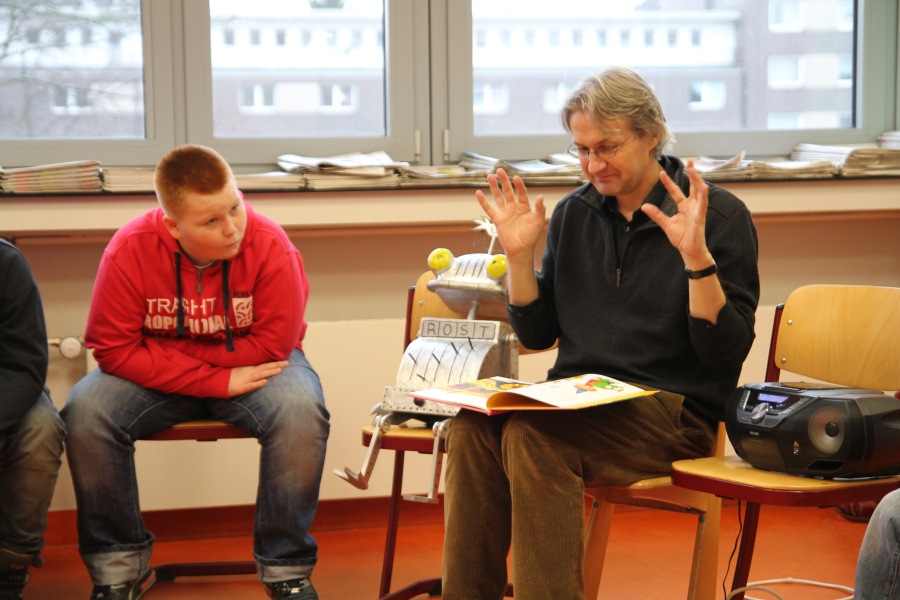 Im Rahmen der Lesetage bekamen die 5. Klassen Besuch von Jörg Hilbert. Der bekannte Kinderbuchautor aus Essen las aus seinem neuen Werk "Ritter Rost und die Zauberfee" und sang mit den Schülerinnen und Schülern einige bekannte Ritter Rost Lieder. Auch Fragen wurden beantwortet und Autogramme gegeben. Unbestrittenes Highlight für die Schüler war es aber, ein mal Ritter Rost persönlich auf dem Schoß sitzen zu haben.