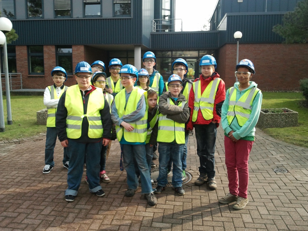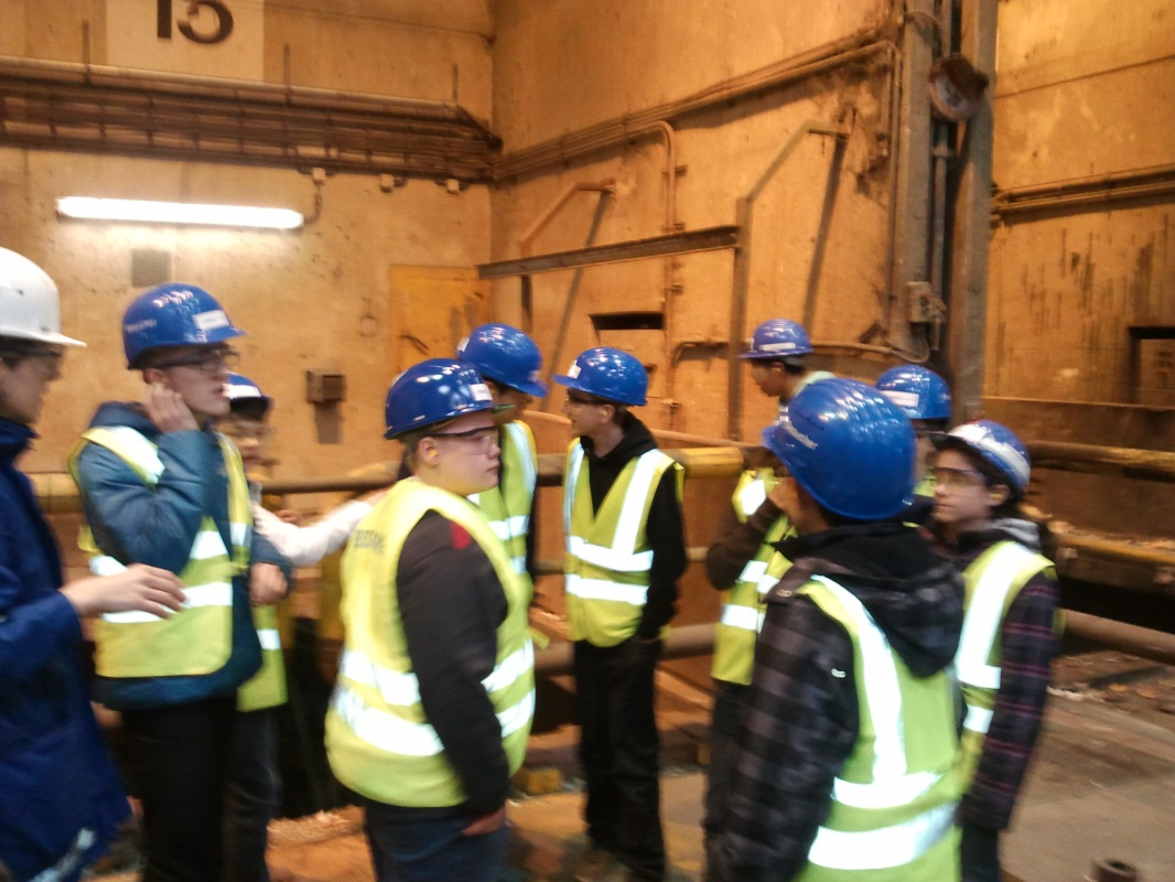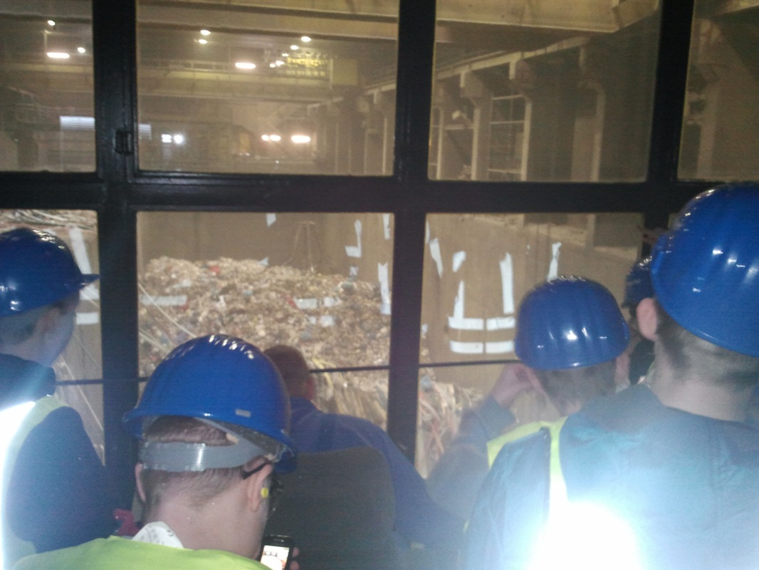 Nach einem guten, informativen Vortrag schlüpften die beiden Klassen in volle Arbeitsmontur: Helm, Schutzweste, Schutzbrille und Gehörschutz waren Pflicht! So gerüstet besichtigte man nacheinander den Müllentladeplatz, den Müllbunker und Führerstand des mächtigen 6t Greifers, das Kesselhaus samt Blick ins lodernde Feuer, den 24 Stunden besetzten Leitstand und stand am Ende direkt am Fuße des mit 200m höchsten Bauwerks des Ruhrgebietes: dem Kraftwerksschornstein.