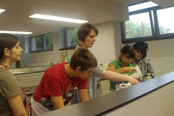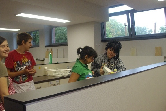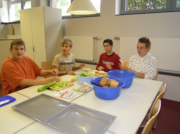 Wer macht was? 2 Schüler gehen einkaufen, 2 Schüler machen die Kasse, 2 Schüler machen das Angebot.